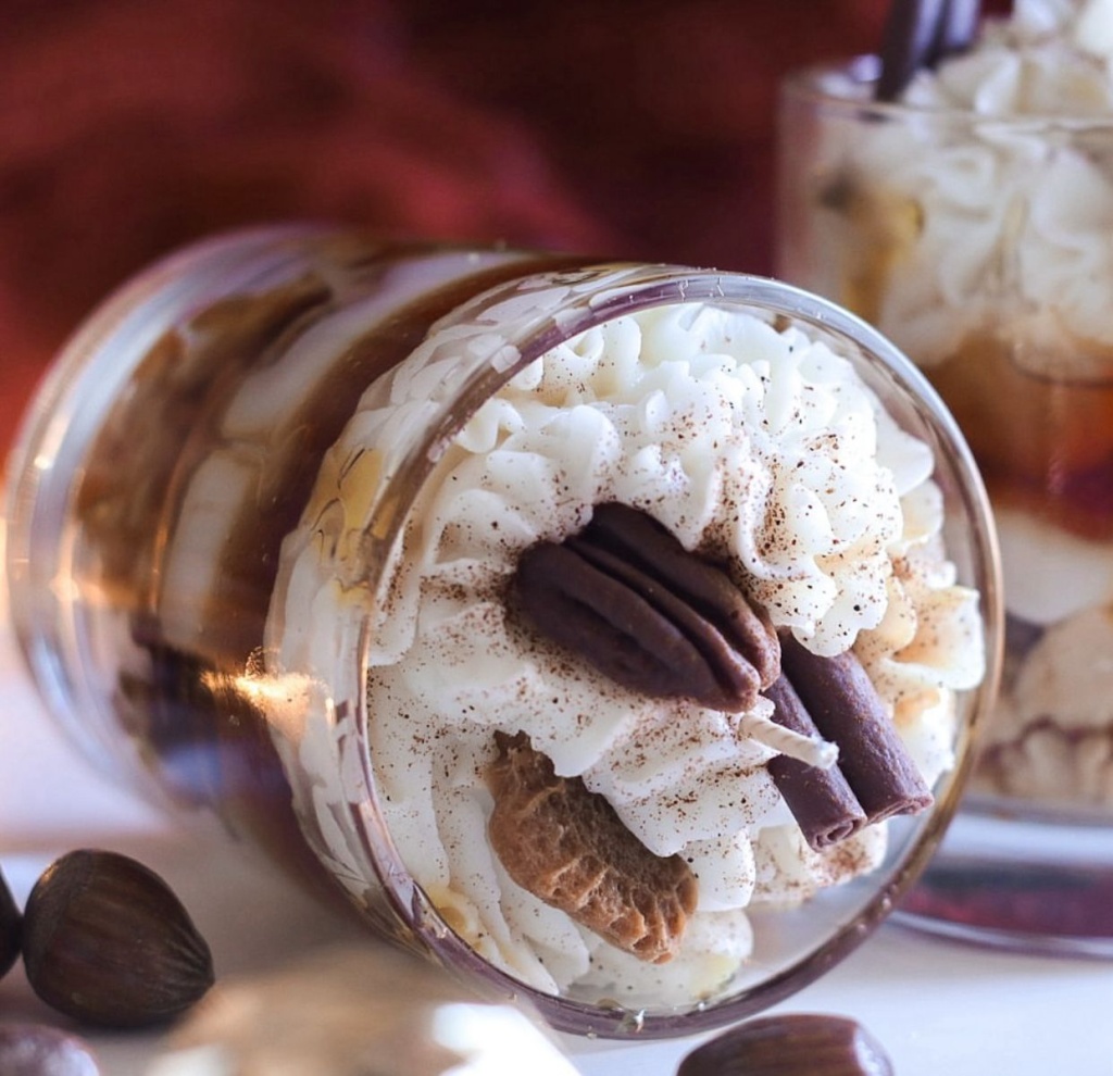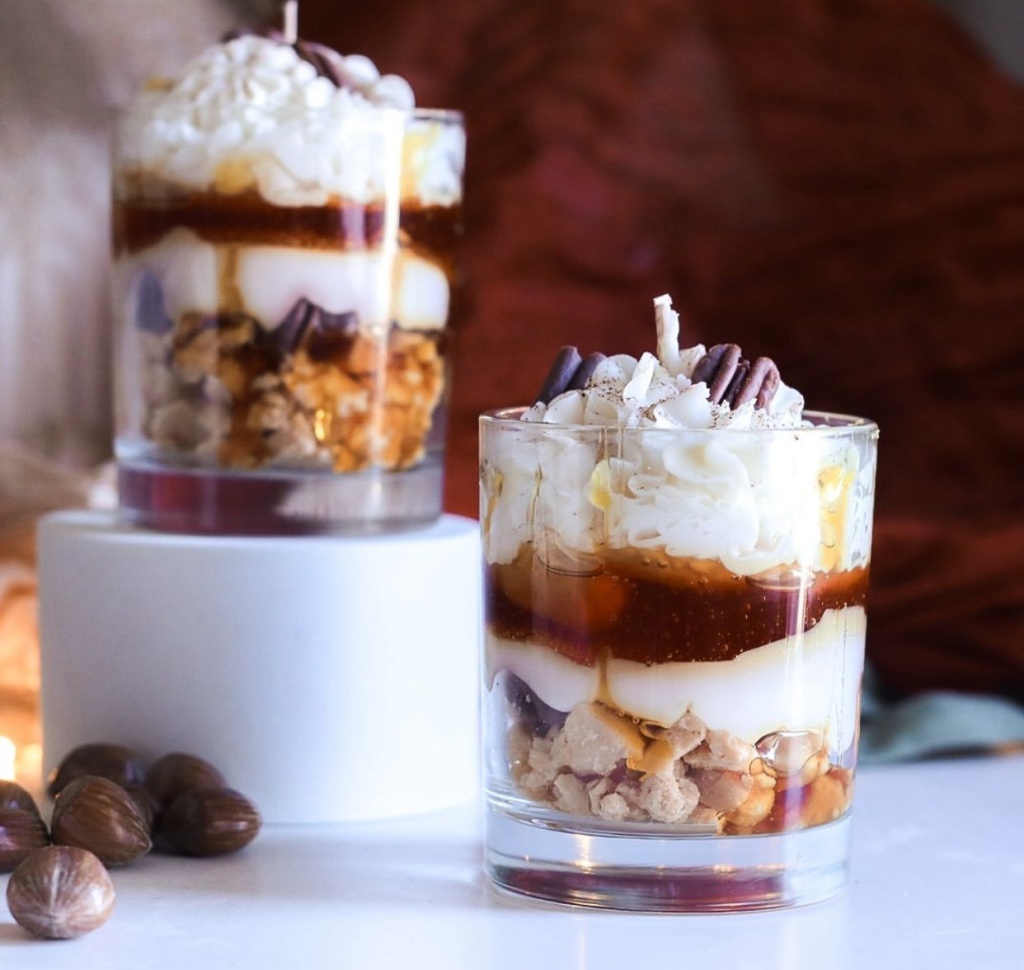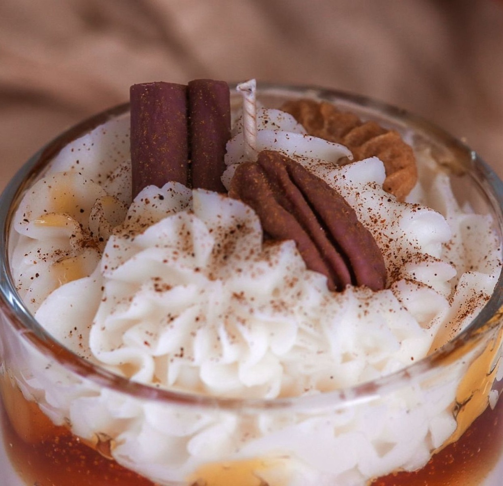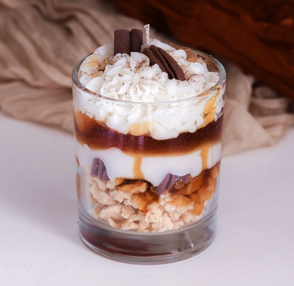 Gerçek bir tatlıyı andıran görünümüyle bulunduğu ortama hem sıcaklık hem de lezzetli bir ambiyans katan Karamelli Tatlı Görünümlü Cam Mum, el işçiliğiyle hazırlanmış özel bir dekoratif mumdur. Üst kısmında kremamsı dokular, alt tabakalarda karameli andıran renk geçişleri ve crunchy görünümlü detaylarla adeta bir bardak tatlı hissi verir.